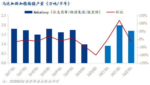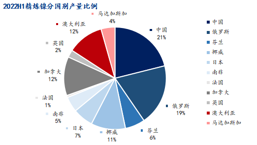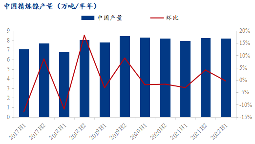 2022上半年,經歷地緣局勢沖突、鎳價巨幅波動、疫情持續、以及多家工廠設備檢修等事件,全球精煉鎳供應環比去年下半年有所減少,同比有小幅增漲。