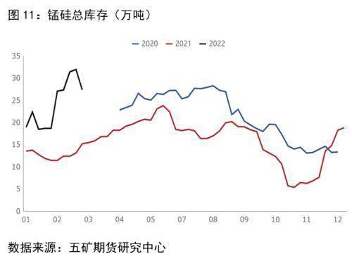 庫存方面,截止3月11日,錳硅總庫存(廠庫+交割庫)27.36萬噸 ,環比-4.68萬噸,-14.61%;錳硅廠庫13.86萬噸,環比-4.82萬噸,-25.82%,交割庫13.49萬噸,環比+0.14萬噸,+1.07%。錳硅庫存水平盡管高于去年同期,但環比改善明顯。