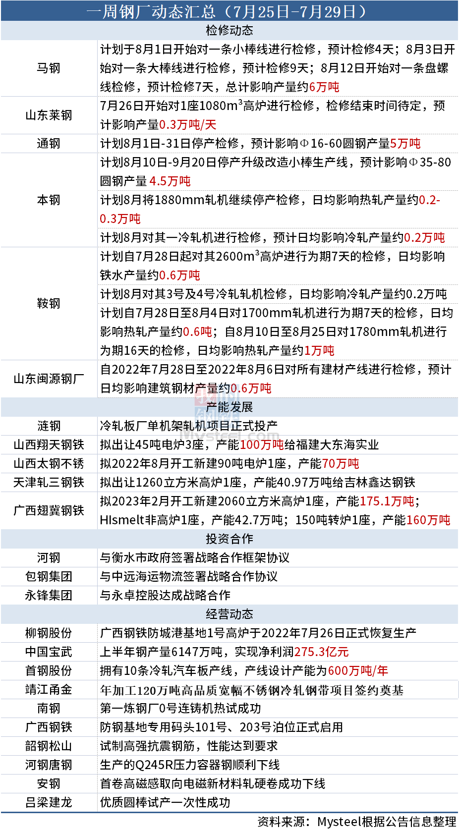 據(jù)Mysteel不完全統(tǒng)計,本周(7月25日-7月29日)有6家鋼廠發(fā)布檢修計劃,具體如下:
