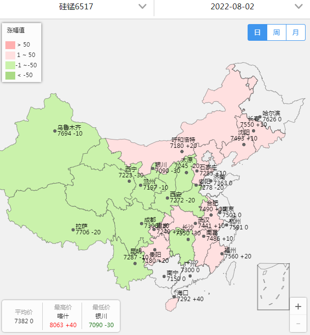 廣東某鋼廠8月硅錳合金采購(gòu)價(jià)格敲定,為承兌含稅到廠7420元/噸;湖南某鋼廠8月硅錳合金招標(biāo)價(jià)格為承兌含稅到廠7480元/噸。