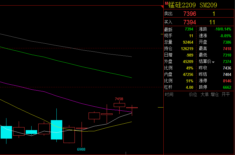 期貨市場(chǎng):今日硅錳期貨主力2209合約震蕩運(yùn)行,受黑色系夜盤震蕩的影響,今日早盤小幅低開(kāi),隨后圍繞日均線震蕩運(yùn)行至收盤。盤中zui高7418點(diǎn),zui低7310點(diǎn),當(dāng)日減倉(cāng)989手,總持倉(cāng)126219手,成交量較上一個(gè)交易日小幅減少,盤面錄得一根帶有一定下影線的小陽(yáng)K線。今日盤面震蕩運(yùn)行,黑色系整體探底回升,短期來(lái)看,黑色系整體較強(qiáng),硅錳合金對(duì)黑色系走勢(shì)粘合性較高,但終端需求依舊并未出現(xiàn)明顯改善,區(qū)間運(yùn)行為主。操作建議:小倉(cāng)位操作,并做好止盈止損。(僅供參考)